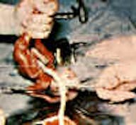 In this most common abortion method the cervix is dilated and a hollow tube with a knife-edged tip is inserted into the uterus. The suction machine, 29 times more powerful than a vacuum, rips the baby apart and sucks him into a bottle. The abortionist’s assistant then puts the baby back together like a puzzle to make sure no parts of the baby were left in the womb.